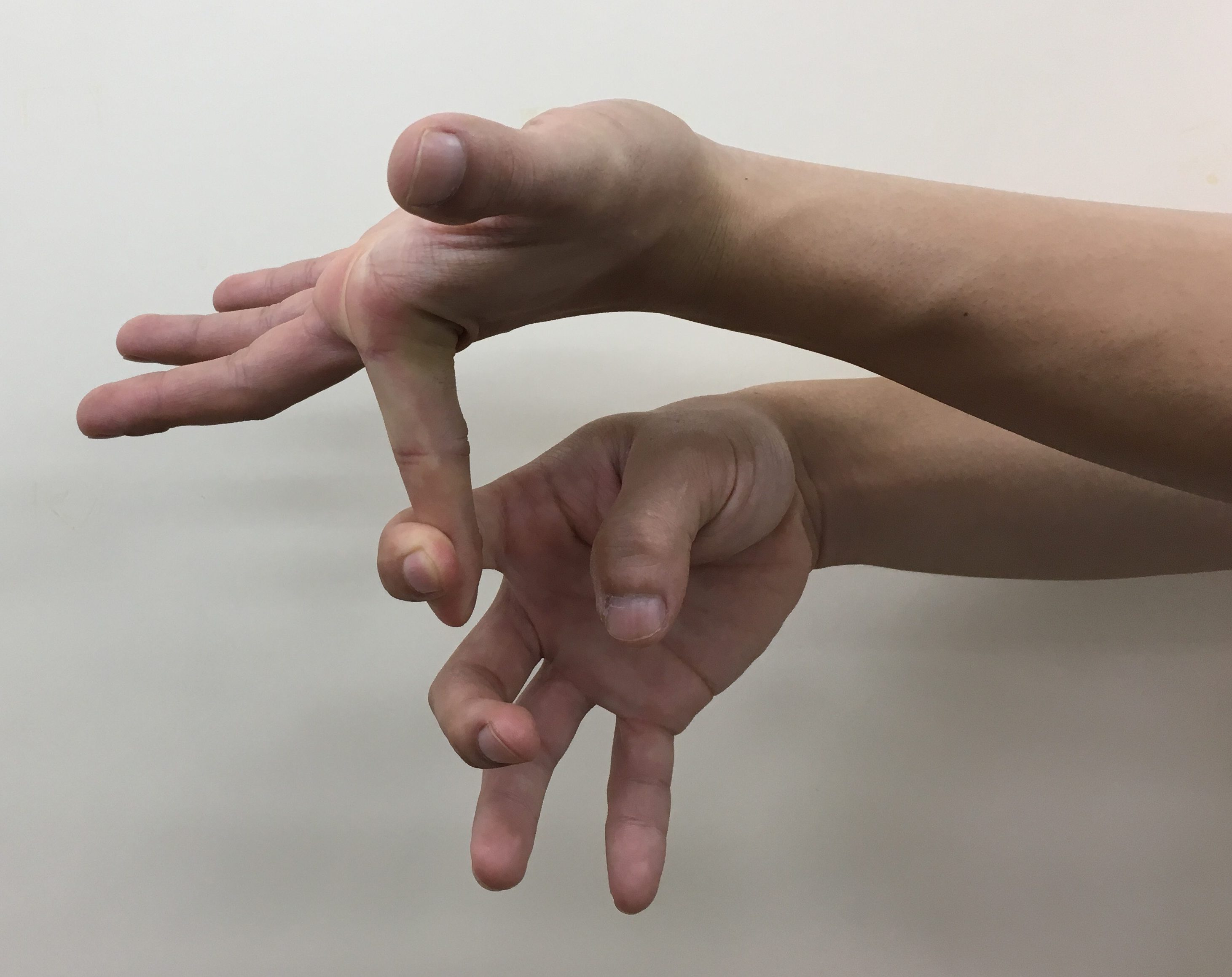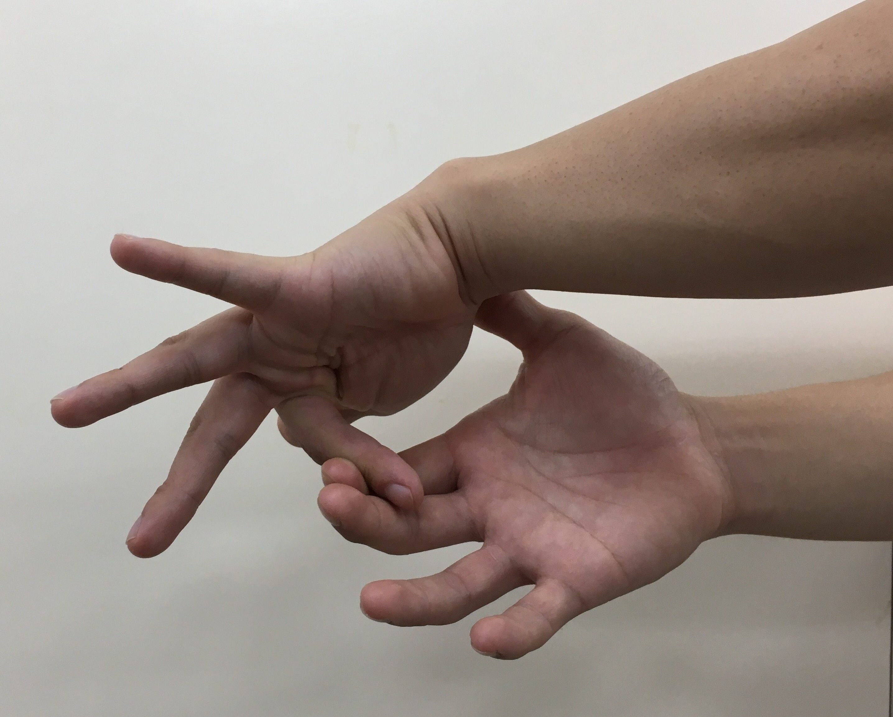 下の画像は反対の手で指を曲げることで前腕の伸筋(長橈側手根伸筋)の