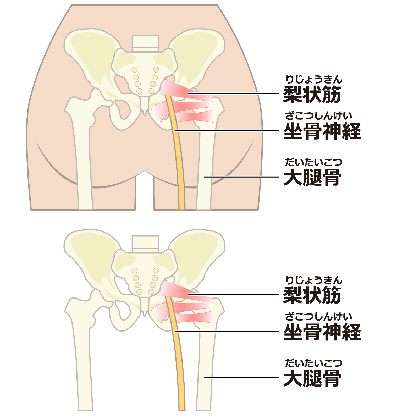 坐骨神経は腰から足にかけて伸びている神経で、何らかの原因で神経が圧迫・刺激されると関連する部分に痛みや痺れなどの症状が出ます。