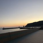 まだ薄暗い温泉街を抜けて海岸から朝日が昇るのを見てきました。