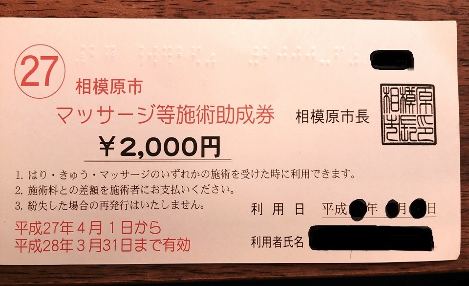この券は相模原市内在住、在宅の70歳以上の方が使える施術助成券となります!