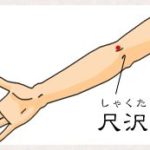 位置:手のひらを上にして、肘を曲げると、肘の内側に横ジワができます。その横ジワの線上で、親指側の先端にあります