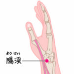 位置:手の甲を上にして、中指と薬指の骨の間を、手首へ向かって指で押しながらずらしてくると、手首にあるくぼみでとまるところ